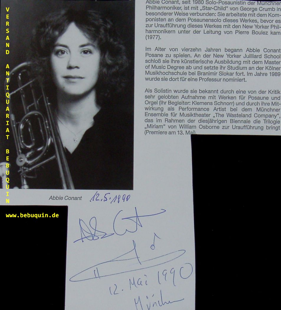 CONANT, Abbie (Posaunistin): eigenhändig signierte und datierte Portraitseite mit graphischem Element.. München, 12.5.1990. 18 x 16,5 cm. 1 Blatt. selten. Abbie Conant (* 14. März 1955) ist eine US-amerikanische Posaunistin, Professorin und Performerin. (Wikipedia)