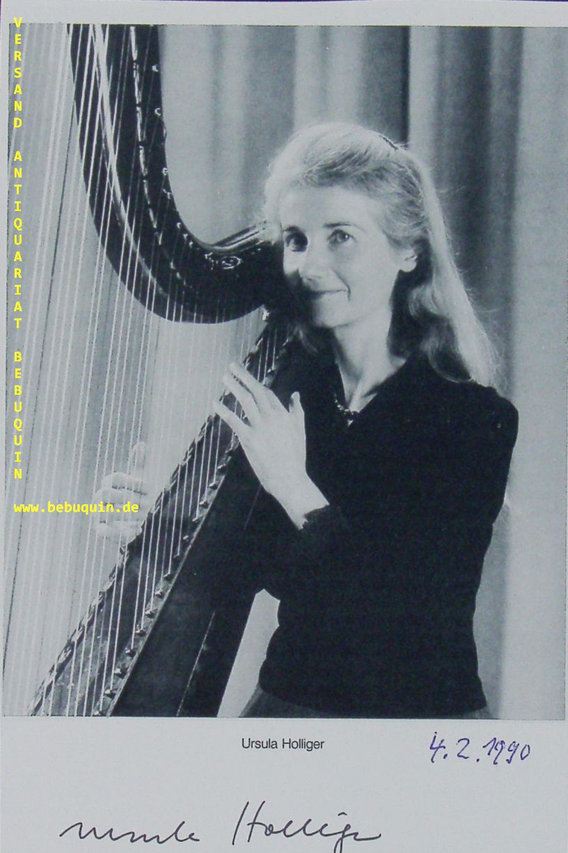 HOLLIGER, Ursula (Harfenistin): eigenhändig einzeln signierte und datierte Portraitseite. München (Herkulessaal), 4.2.1990. 18 x 12 cm. 1 Bl. Ursula Holliger, geboren als Ursula Hänggi (* 8. Juni 1937 in Basel; † 21. Januar 2014 ebenda), war eine Schweizer Harfenistin. Sie zählte zu den führenden Harfenisten ihrer Zeit und engagierte sich besonders auf dem Gebiet der zeitgenössischen Musik. (Wikipedia)