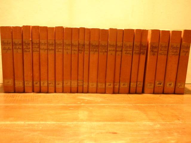HERDER, Johann Gottfried von: Sämmtliche Werke. Hrsg. durch Johann von Müller, Heyne. 22 (von 45) Bände. Tübingen (Cotta), 1806 – 1820. je Band ca 400 S. Pb ca 1900 mit zwei Rückenschildchen, feine Erhaltung. Ausgabe aus der Bibliothek der Wittelsbacher mit kleinen Papierrückenschildchen in guter Erhaltung. EA WG 84 (Sophron) + WG 81 mit folgenden Einzelbänden: 1. Adrastea. Begebenheiten und Charaktere des 18. Jahrhunderts (1809). 2. Adrastea und das 18. jahrhundert. Und Briefe zu Beförderung der Humanität (1809). 3. + 4. Erinnerungen aus dem Leben Joh. Gottfrieds von Herder. Gesammelt von Maria carolina von Herder. 2 Bände (1820). 5. + 6. Kritische Wälder. 1., 2. + 3. Wäldchen in 2 Bänden (1806). 7. + 8. Christliche Schriften. 2 Bände (1810). 9. + 10. Gedichte in 2 Bänden (1817). 11. Dramatische Stücke und Dichtungen (1806). 12. Erläuterungen zum neuen Testament (1806). 13. Blumenlese aus morgenländischen Dichtern (1807). 14. Schriften zur griechischen Literaut (1808). 15. Nachlese historischer Schriften (1814). 16. Kalligone (1819). 17. Briefe, das Studium der theologie betreffend (1808). 18. Früchte aus den sogenannt goldenen Zeiten des 18. Jahrhunderts (1809). 19. Vom Studium der Theologie und dem Christoichen Predigamt (1808). 20. Salomo’s Lieder der Liebe. Johannes Offenbarung (1807). 21. Terpsichore (1815). 22. Sophron. Gesammelte Schulredem (1810).