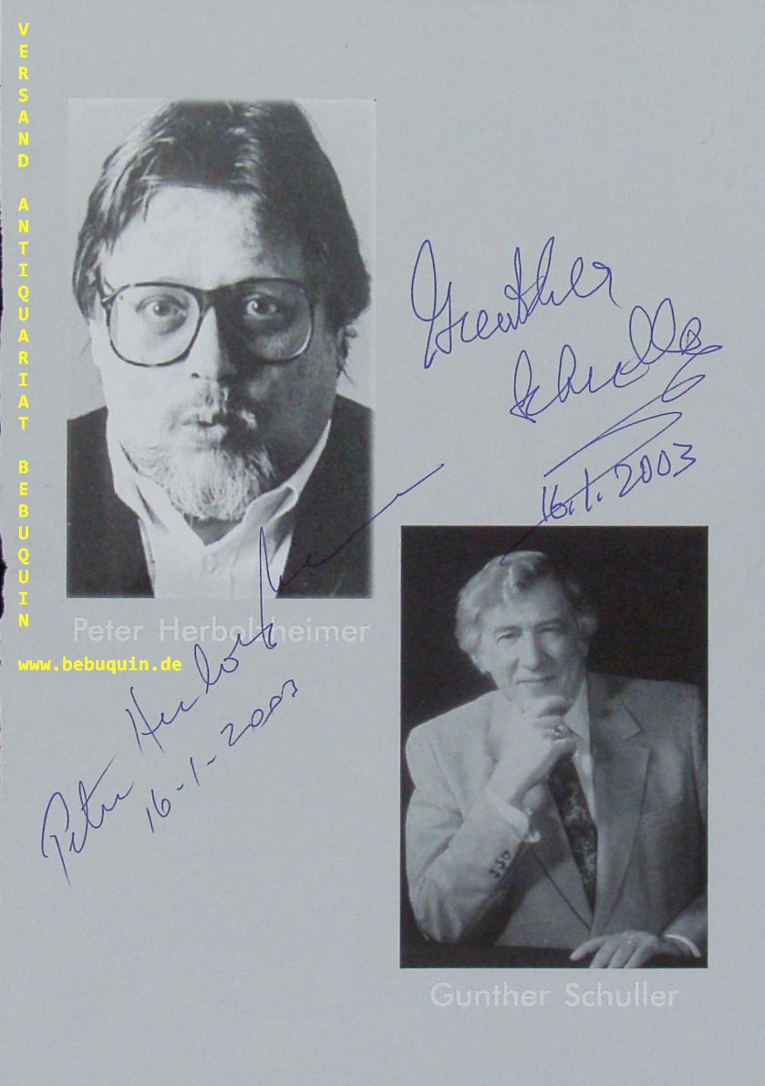JAZZ.– HERBOLZHEIMER, Peter (Posaunist) + SCHULLER, Gunther (Hornist): eigenhändig von beiden signierte und datierte Portraitseite. München (Philharmonie), 16.1.2003. 21 x 14,5 cm. 1 Bl. Peter Alexander Herbolzheimer (* 31. Dezember 1935 in Bukarest, Rumänien; † 27. März 2010 in Köln) war ein deutscher Jazz-Posaunist und Bandleader. Gunther Alexander Schuller (* 22. November 1925 in New York City, New York; † 21. Juni 2015 in Boston, Massachusetts[1]) war ein US-amerikanischer Hornist, Komponist, Musikwissenschaftler und Dirigent. (Wikipedia)