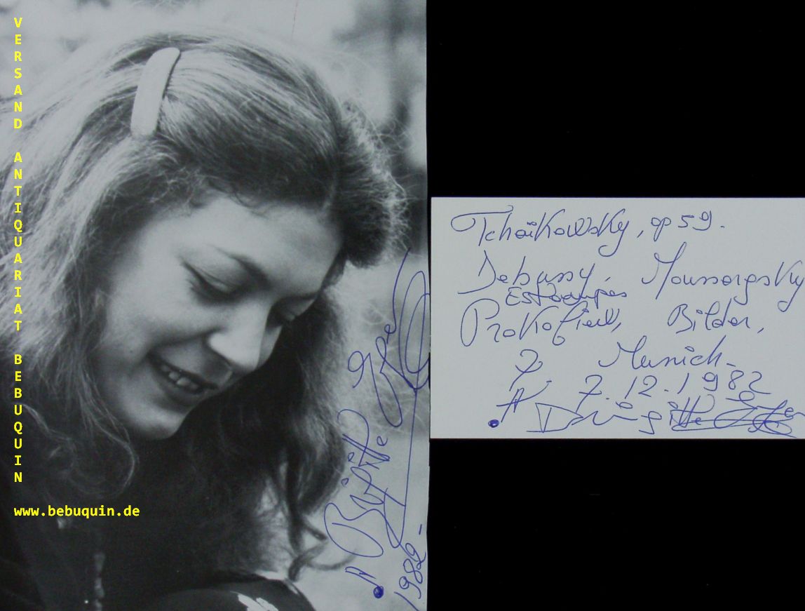 ENGERER, Brigitte (Pianistin): eigenhändig signierte und datierte Portraitseite + eigenhändig signierte und datierte Autogrammkarte. München (Herkulessaal), 7.12.1982. 8 x 12,5 + 19 x 14 cm. Karteikarte + 1 Blatt.