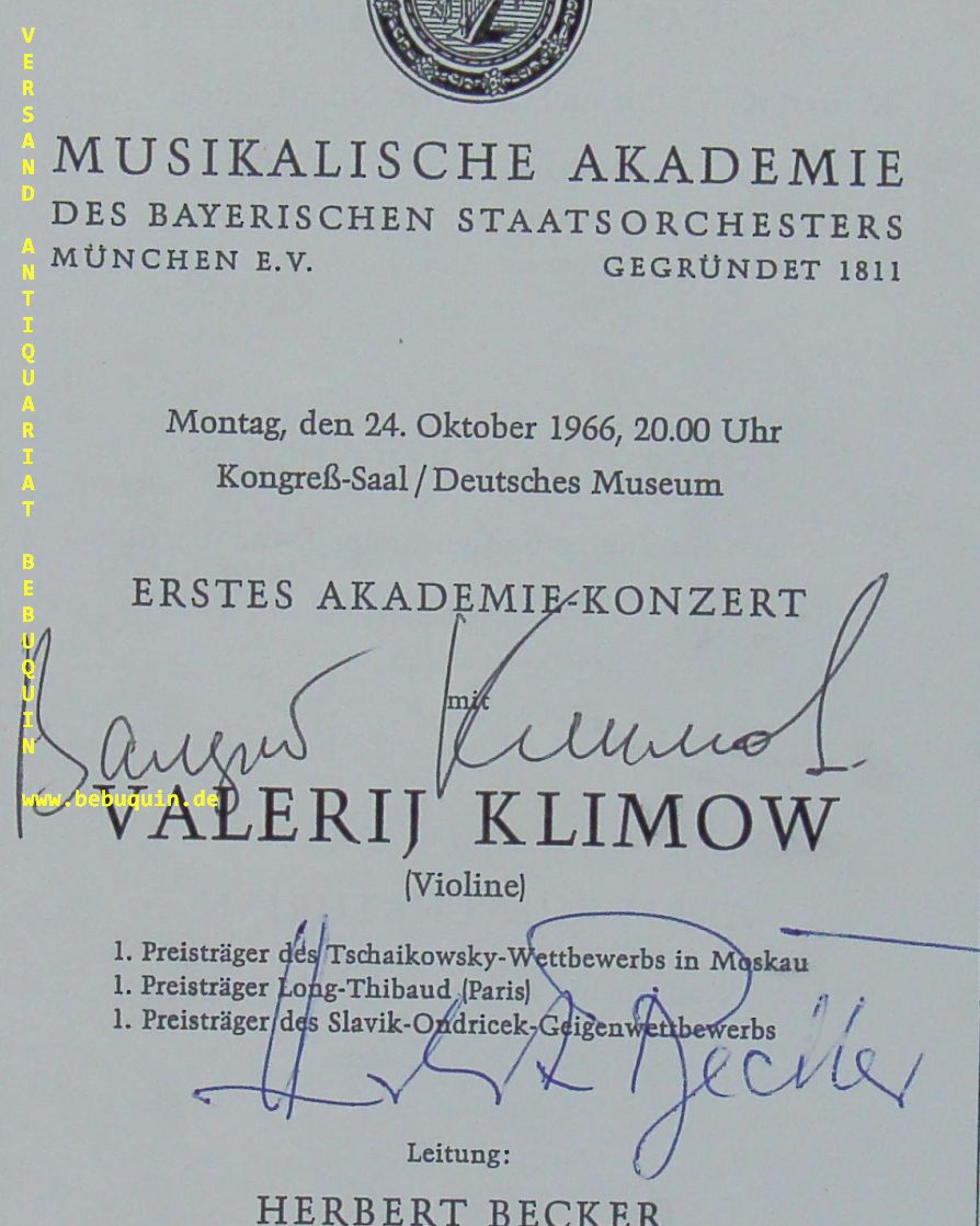 KLIMOW, Valerij (Violinist) + BECKER, Herbert (Dirigent): eigenhändig von beiden signierte Programmseite. München (Philharmonie), 24.10.1966.. 14 x 11,5 cm. 1 Bl. Waleri Alexandrowitsch Klimow (* 16. Oktober 1931 in Kiew) ist ein russischer Geiger und Geigenlehrer. (Wikipedia)