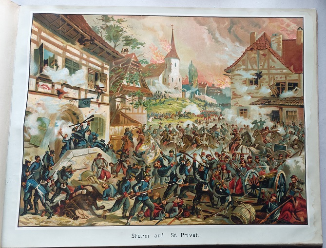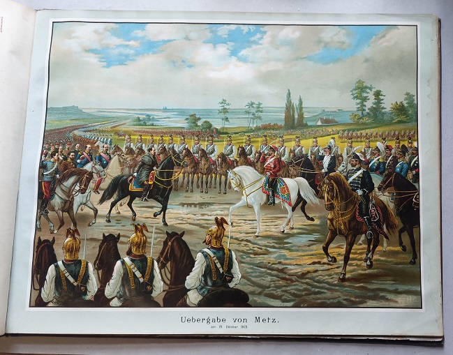 MAY.– DITTRICH, Max: Der Deutsch-Französische Krieg 1870 und 1871. 40. Aufl. Dresden (Münchmeyer), 1895. 44 x 56 cm. 1 Bl., 86 S. mit 26 (davon 24 farb.) lithogr. Taf. v. Max Henze sowie zahlr. Textholzschnitten. Oln. mit Blind- und Schwarzprägung. Einband etwas gewellt, bestaubt und berieben. Innen teils etwas fingerspurig mit teils hinterlegten Randläsuren und kaum schmutzrandig. Insgesamt noch gut. Jubel-Ausgabe zur 25jährigen Wiederaufrichtung des Deutschen Reiches mit allen Tafeln. Die Tafeln ganz im Stile eines Volksbuches in kräftigen Farben gehalten, zeigen die wichtigsten Schlachten des Krieges meist mit Hintergrundansichten: Erstürmung des Gaisberges./ Reiterangriff bei Reichshofen. / Angriff d. franz. Cürassire bei Morsbrunn./ Erstürmung der Spicherer Höhen./ Reitergefecht bei Buzancy./ Waldkampf bei Sedan./ Reiterangriff bei Sedan./ Schlacht bei Artenay. / Erstürmung von Orleans./ Gefecht bei Raon l’ Etape./ Erstürmung von Chateaudun./ Erstürmung von Le Bourget./ Beschiessung von Strassburg./ Schlacht bei Champigny./ Schlacht bei Monbeliard./ Schlacht bei St. Quentin./ Uebergang Bourbaki’s in die Schweiz./ Truppeneinzug in Dresden am 11. Juli 1871 (ganzseitiger Holzstich)./ Das Nationaldenkmal auf dem Niederwald. (s/w) / Einzug in Berlin (s/w)./ König Wilhelm von Preussen u. sein Generalstab (s/w)./ Schlacht bei Beaumont./ Reitergefecht bei Mars la Tour./ König Wilhelm bei Rezonville./ Sturm auf St. Privat./ Uebergabe von Metz./ Erstürmung von Dijon./ Einzug in Paris am 1. März 1871. Der Freund und Knastkumpan Karl Mays, Julius Eduard Maximilian Dittrich (10.6.1844 – 10.5.1917) war Hauslehrer, Journalist und ab 1870 Redakteur verschiedener Zeitungen in Dresden. Da der frühere kaufmännische Angestellte vom 13.7.1866 – 13.1.1868 wegen Betrugs und Unterschlagung in Schloss Osterstein inhaftiert war, kannten sich May und Dittrich vermutlich bereits aus dieser Zeit. (May sass ab 14.6.1865 ebendort ein.) Dittrich erklärte dazu am 25. November 1908: „Es ist richtig, daß ich May das erste Mal in Schloß Osterstein in Zwickau gesehen habe, und zwar im Jahre 1866. Gesprochen habe ich ihn damals aber nicht.″