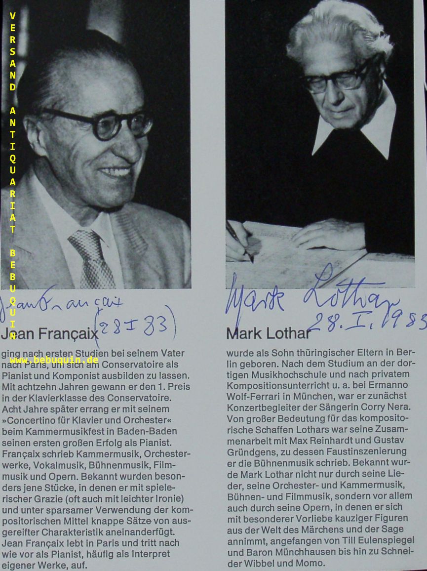 FRANCAIX, Jean (Komponist) + LOTHAR, Mark (Komponist): eigenhändig von beiden signierte Programmseite. München (Philharmonie), 28.1.1983. 19,5 x 15 cm. 1 Bl. Jean Françaix (* 23. Mai 1912 in Le Mans als Jean René Désiré Françaix; † 25. September 1997 in Paris) war ein französischer Komponist. Er war auch ein Klaviervirtuose, allerdings widmete er seine Schaffenskraft hauptsächlich seiner kompositorischen Tätigkeit. Seine Werke sind originell, witzig, rhythmisch komplex, die Harmonien sind einfach. Er prägte den Begriff „Höllenorchester“ für eine Instrumentengruppe, die sich durch einen lauten, monströsen und „schnarrenden“ Klangeindruck auszeichnet. So wurden dieser Gruppe unter anderen Fagott, Klarinette, E-Gitarre, Pauken, Schlagwerk und Akkordeon zugeordnet. Mark Lothar (eigentlich Lothar Hundertmark; * 23. Mai 1902 in Berlin; † 6. April 1985 in München) war ein deutscher Komponist. (Wikipedia)