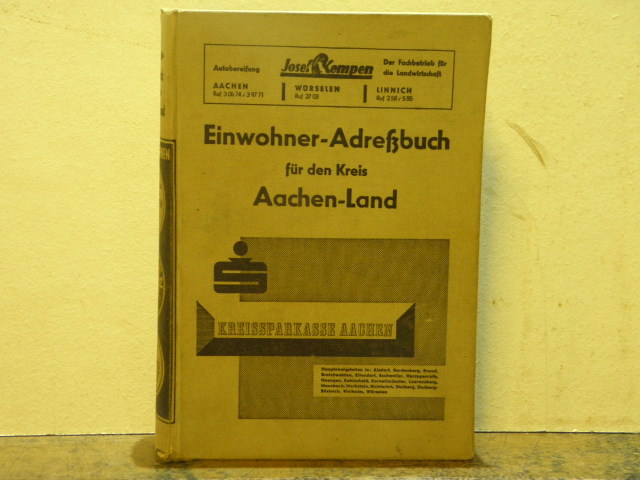 AACHEN.– EINWOHNER- / ADRESS-BUCH FÜR DEN KREIS AACHEN – LAND 1962.– Bearb. und zusammengestellt nach amtlichen Unterlagen. 6. Ausgabe. Rheydt (Jakobs), 1962. Gr. 8°. 8 Bl., 40, 66, 100, 24, 91, 50, 288, 120 S. ill. OLn. fein erhalten.