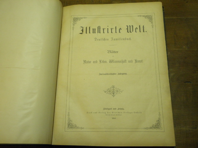 DIE ILLUSTRIRTE WELT.– 1884. Deutsches Famiienbuch. Blätter aus Natur und Leben, Wissenschaft und Kunst zur Unterhaltung und Belehrung für die Familie, für Alle und Jeden. 52 Nummern in 1 Bd. Stuttgart (Hallberger), 1884. Fol. IV, 624 S. mit zahlr. Illustrationen. HLdr der Zeit mit goldgeprägtem Rücken. gut erhalten. = 32. Jahrgang. Mit Bilder von Affentheater, KIrche in Burgos, Suhl,Federaun, Szegedin, Hannoversche Kochschule, Rathaus München, Mississippidampfer, Rathaus in Wien, Kartenspieler, Schiffshospital in New York, Johannes Schilling, Distanzschwimmer Matthew Webb etc sowie Texten von Renz, Clara Jäger etc.