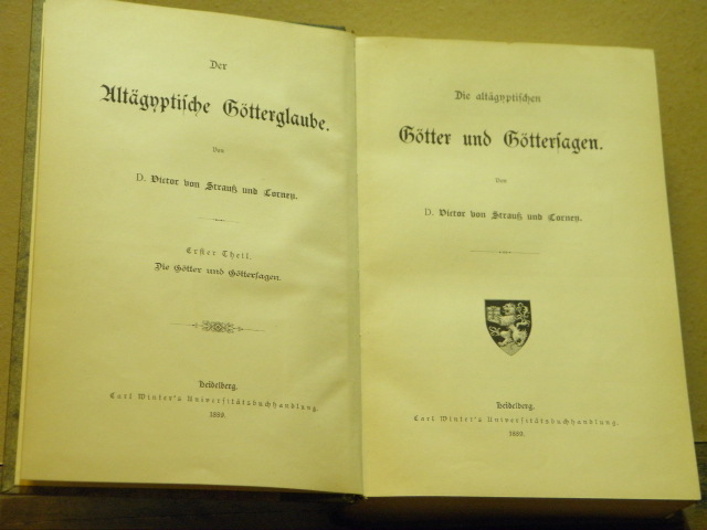 ÄGYPTEN.– STRAUSS UND TORNEY, Victor von: Der altägyptische Götterglaube. Götter und Göttersagen. + Entstehung und Geschichte des altägyptischen Göttergaubens. 2 Theile in 1 Bd. Heidelberg (Winter), 1889 / 1891. XII, 501 (1), VI, 404 S. späterer HLn mit goldgeprägtem Rücken. gut erhalten. EA des gesuchten Standardwerks.