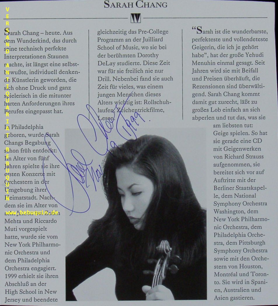 CHANG, Sarah (Violinistin): eigenhändig signierte und datierte Portraitseite. München (Herkulessaal), 19.11.1999. 18 x 16,5 cm. 1 Bl. Sarah Chang (* 10. Dezember 1980 in Philadelphia als Sarah Yong-ju Chang) ist eine US-amerikanische Violinistin. (Wikipedia)
