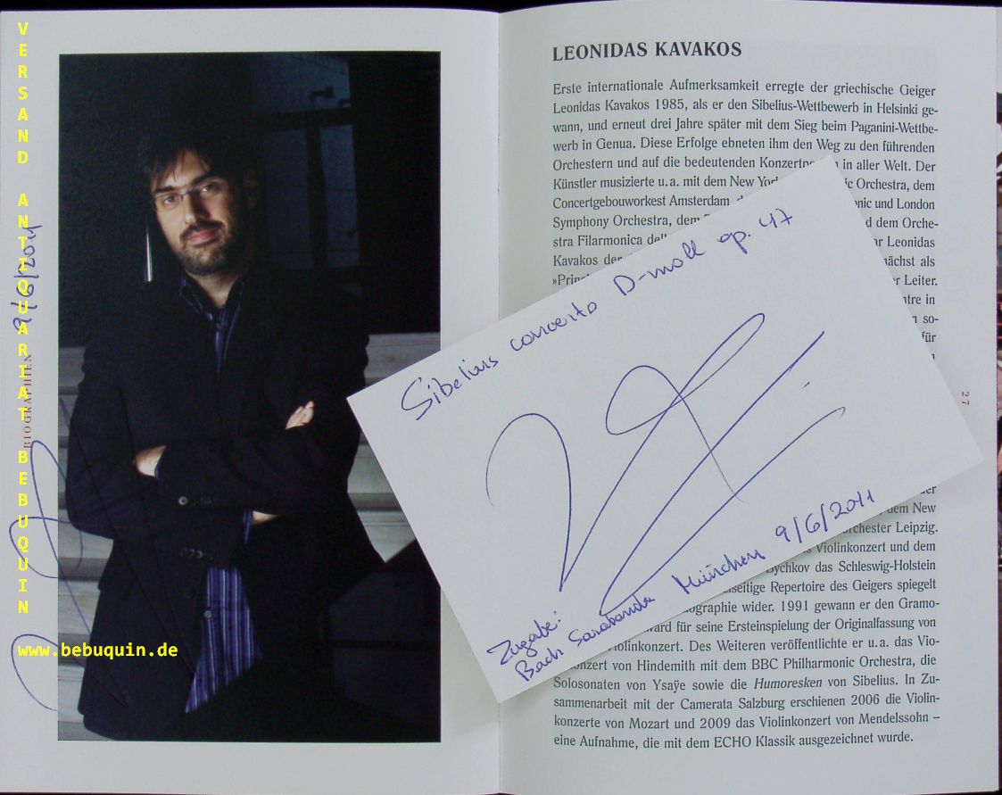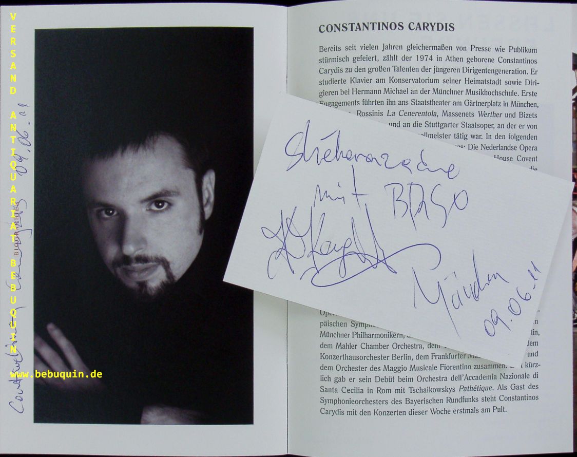 KAVAKOS, Leonidas (Pianist) + CARYDIS, Constantinos (Dirigent): 2 eigenhändig signierte und datierte Autogrammkarten. München (Philharmonie), 9.6.2011. 8 x 12,5 cm. 2 Karteikarten in ca 40seitiges illustriertes Programmheft. Diese vom Dirigenten eigenhändig an seinem Bild signiert. Constantinos Carydis (geboren am 1. Januar 1974 in Athen) ist ein griechischer Dirigent. Leonidas Kavakos (* 30. Oktober 1967 in Athen in Griechenland) ist ein griechischer Violinist und Dirigent. (Wikipedia)