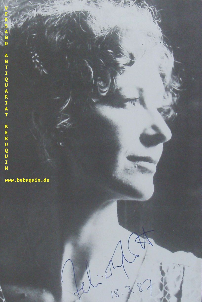 LOTT, Felicity (Sopran): eigenhändig signierte und datierte Portraitseite. München (Philharmonie), 18.3.1987. 8 x 12,5 cm. 1 Bl. schönes Portrait. Dame Felicity Lott (* 8. Mai 1947 in Cheltenham) ist eine englische Opern- und Konzertsängerin (Mezzosopran). (Wikipedia)
