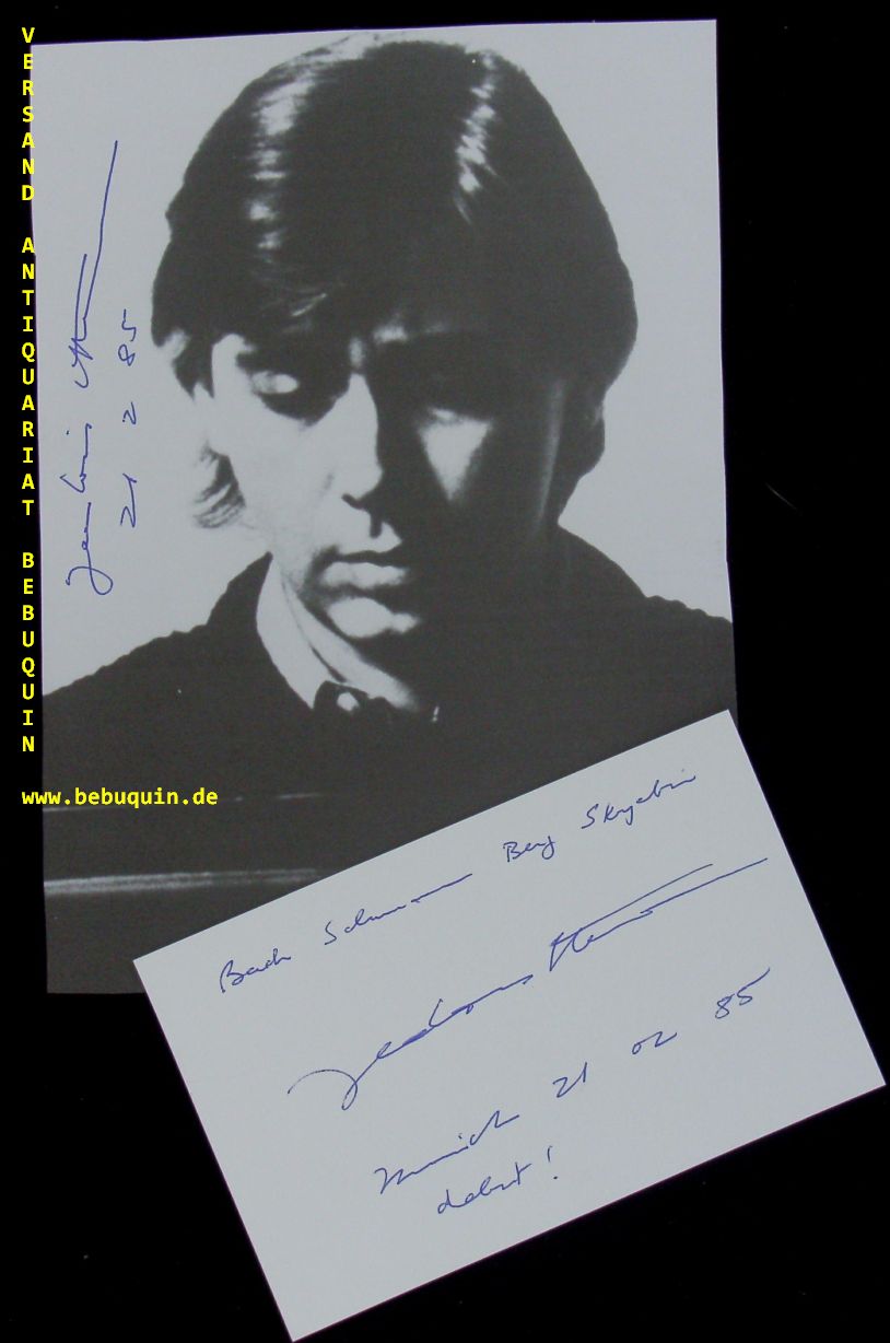 STEUERMAN, Jean-Louis (Pianist): eigenhändig signierte und datierte Autogrammkarte + eigenhändig signierte und datierte Portraitseite. München (Philharmonie), 21.2.1985. 8 x 12,5 + 21 x 17,5 cm. 2 Bl. Jean Louis Steuerman was born in Rio de Janeiro into a musical family. He began his studies at an early age and made his debut with the Brazilian Symphony Orchestra when he was just fourteen. He came to Europe with a scholarship to the Naples Conservatory in 1967. He was a Winner at the J S Bach Competition in Leipzig and quickly gained recognition throughout Europe as a soloist and recitalist.