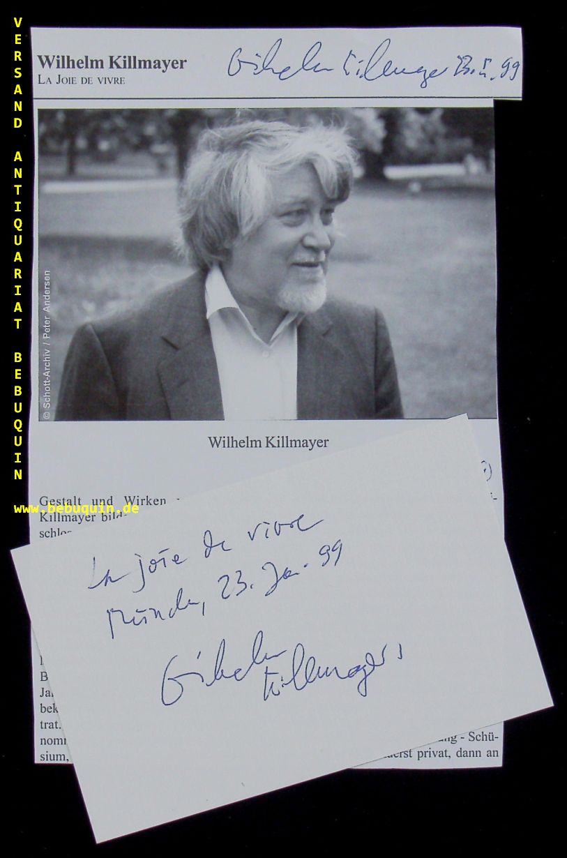 KILLMAYER, Wilhelm (Komponist): eigenhändig signierte und datierte Portraitseite + eigenhändig signierte und datierte Autogrammkarte. München (Philharmonie), 23.1.1999. 19,5 x 13 + 8 x 12,5 cm. 2 Bl. Wilhelm Killmayer (* 21. August 1927 in München; † 20. August 2017 in Starnberg)[1] war ein deutscher Komponist. Er komponierte für Klavier, Kammermusik, Symphonien, Opern, Ballettmusik und Vokalmusik, darunter mehr als 200 Lieder. (Wikipedia)