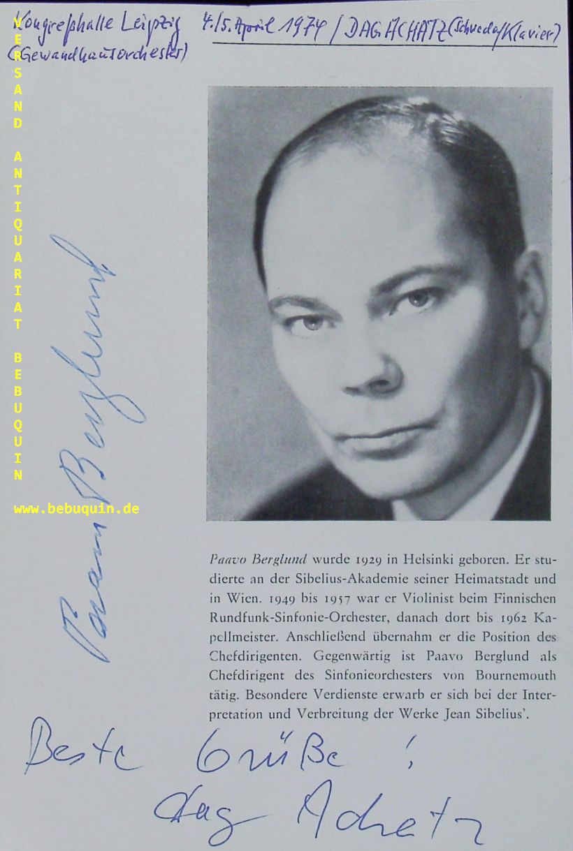BERGLUND, Paavo (Dirigent) + ACHATZ, Dag (Pianist): eigenhändig von beiden signierte Portraitseite. Leipzig (Gewamdhaus). 4.4.1974. 10 x 13,5 cm. 1 Bl. Paavo Berglund (* 14. April 1929 in Helsinki; † 25. Januar 2012 ebenda) war ein finnischer Dirigent. Dag Achatz is a Swedish pianist and composer. (Wikipedia)