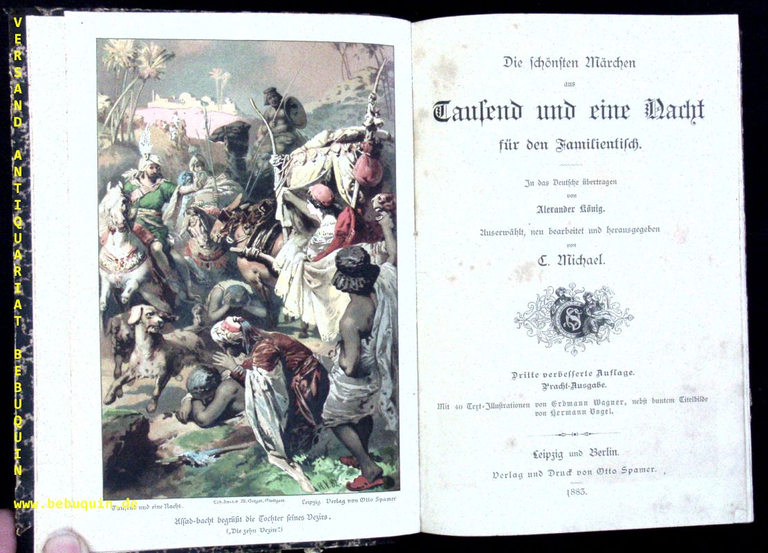 MICHAEL, C.: (Hrsg.) Die schönsten Märchen aus Tausend und eine Nacht für die Kinderstube. D.v. Alexander König. 3., verb. Aufl. Leipzig (Spamer), 1883. 362 S. mit 40 Textill. von Erdmann Wagner und buntem Titelbild von Hermann Vogel. HLn der Zeit. vereinzelt bruanfleckig. = Pracht – Ausgabe.