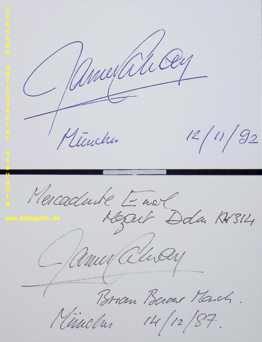 GALWAY, James (Flötist): 2 eigenhändig signierte und datierte Autogrammkarten. München (Philharmonie), 14.12.1987 + 12.11.1992. 8 x 12,5 cm. 2 Karteikarten. Sir James Galway (* 8. Dezember 1939 in Belfast, Nordirland) gilt als einer der bedeutendsten klassischen Flötisten des späten 20. und frühen 21. Jahrhunderts. Als einer der ersten Flötisten wagte er eine Solokarriere ohne Bindung an ein Orchester und wurde damit erfolgreich. Galway ist berühmt für seine außergewöhnliche Virtuosität und sein ausdrucksstarkes Spiel mit unverwechselbarem Klang. Sein Beiname The Man with the Golden Flute („der Mann mit der goldenen Flöte“) stammt aus der Zeit seiner frühen Solokarriere, als Goldflöten noch sehr selten waren. (Wikipedia)