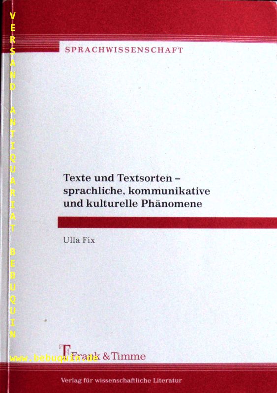 GERMANISTIK.– FIX, Ulla: Texte und Textsorten – sprachliche, kommunikative und kulturelle Phänomene. Berlin (Frank & Timme), 2008. 506 S. mit Abb. OKart. = Soprachwissenschaft, Bd. 5. EA mit einer eigenhändigen 7zeiligen persönlichen datierten Widmung der Verfasserin auf Vortitel. Ulla Fix (* 14. August 1942 in Arnstadt) ist eine deutsche Sprachwissenschaftlerin. Sie ist emeritierte Professorin für deutsche Sprache der Gegenwart der Universität Leipzig. (Wikipedia)