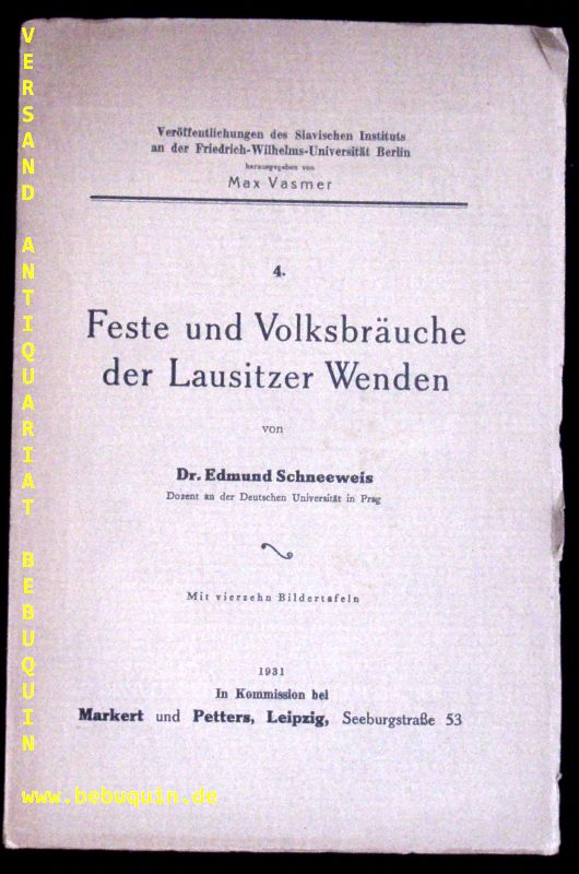 LAUSITZ.– SCHNEEWEIS, Edmund: Feste und Volksbräuche der Lausitzer Wenden. Leipzig (Markert & Petters), 1931. Gr. 8. VIII, 251 S. mit 14 Bildertafeln. OKart. unaufgeschnitten. = Veröffentlichungen des Slavischen Instituts an der Friedrich-Wilhelms-Universität Berlin, Bd. 4.