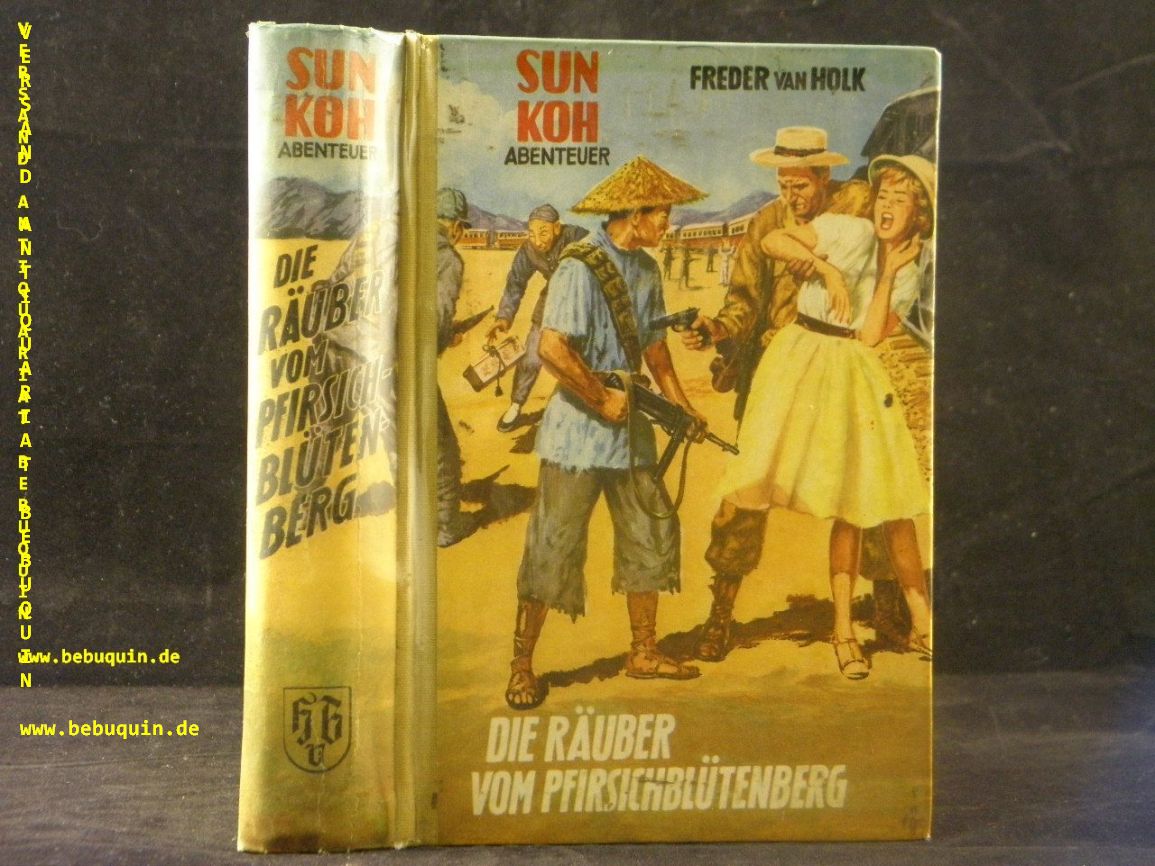 SUN KOH.– HOLK, Freder van: Die Räuber vom Pfirsichblütenberg. Abenteuer-Roman. Münster (Borgsmüller), ca 1960. 253 S. farb. ill. OHLn. gestempeltes Leihbuch. EA.