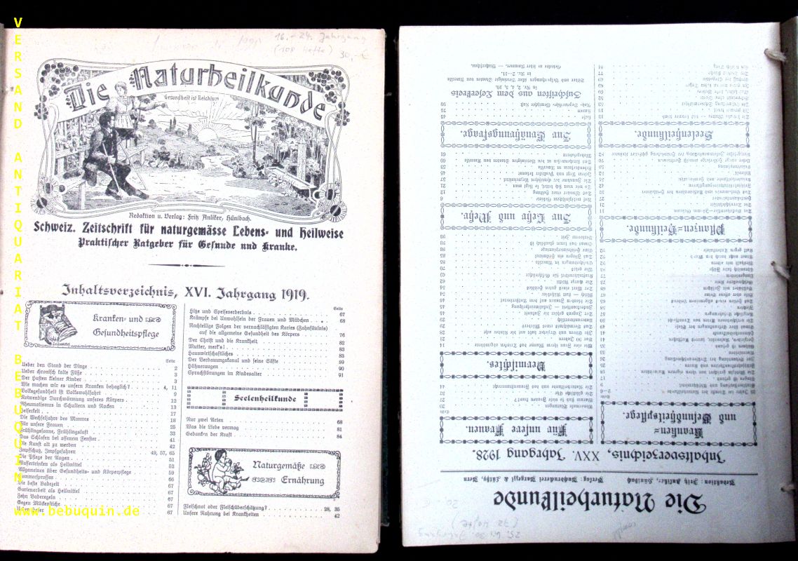 MEDIZIN.– ANLIKER, Fritz: (Hrsg.) Die Naturheilkunde. Schweizerische Zeitschrift für naturgemässe Lebens-und Heilweise. Praktischer Ratgeber für Gesunde und Kranke. 16. – 30. Jahrgang mit 180 Heften. 2 Bände. Bern (Bargezzi & Lüthy), 1919 – 1933. Oktav. ca 800 S. mit zahlr. Abb. HLn der Zeit mit Fadenbindung. eine Lage etwas gelockert, sonst gut erhalten.