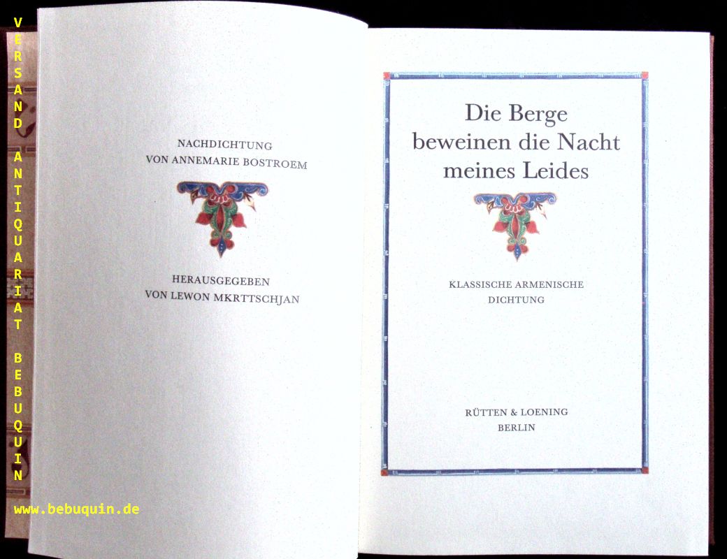 MKRTTSCHJAN, Levon: (Hrsg.) Die Berge beweinen die Nacht meines Leides. Klassische armenische Dichtung. Nachdichtung von Annemarie Bostroem. Berlin (Rütten & Loening), 1983. Gr. 8°. 205 (2) S. mit farb. Buchschmuck von Gabriele Hirsch. OLn mit Goldprägung. EA.