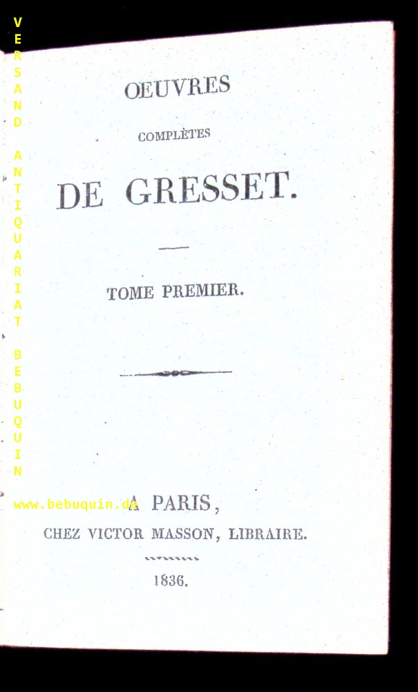 GRESSET, Jean-Baptiste, Louis: Oeuvres complètes. Tome 1 – 2. 2 in 1 Band. Paris (Masson), 1836. 12°. ca 400 S. OPb mit goldgeprägten Lederrückenschildern. Kanten etwas berieben, sonst gut erhalten.