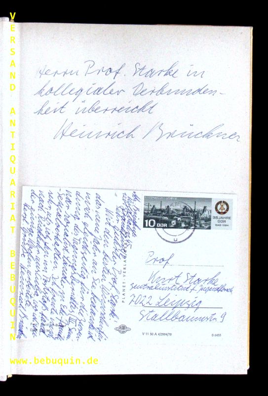 DDR.– BRÜCKNER, Heinrich: Ein Kind wird erwartet. 2. Aufl. Leipzig (Verlag für d. Frau), 1982. Gr. 8°. 191 S. mit zahlr. teils farb. Bildern. OLn mit OUmschl. gutes Ex. Mit einer eigenhändigen voll signierten Widmung des Autors an Professor Kurt Starke auf Vorsatz. Inliegend eine sehr interessante gelaufene Postkarte an denselben: ″ . . . bedanke ich mich für die Zusendung des Tagungsberichtes / III. Seminar sozialist. Länder zu Ehe-Familie-Sexualverhalten . . . nach meiner Rückkehr aus Cuba, wo ich wieder einige Wochen arbeitete.″