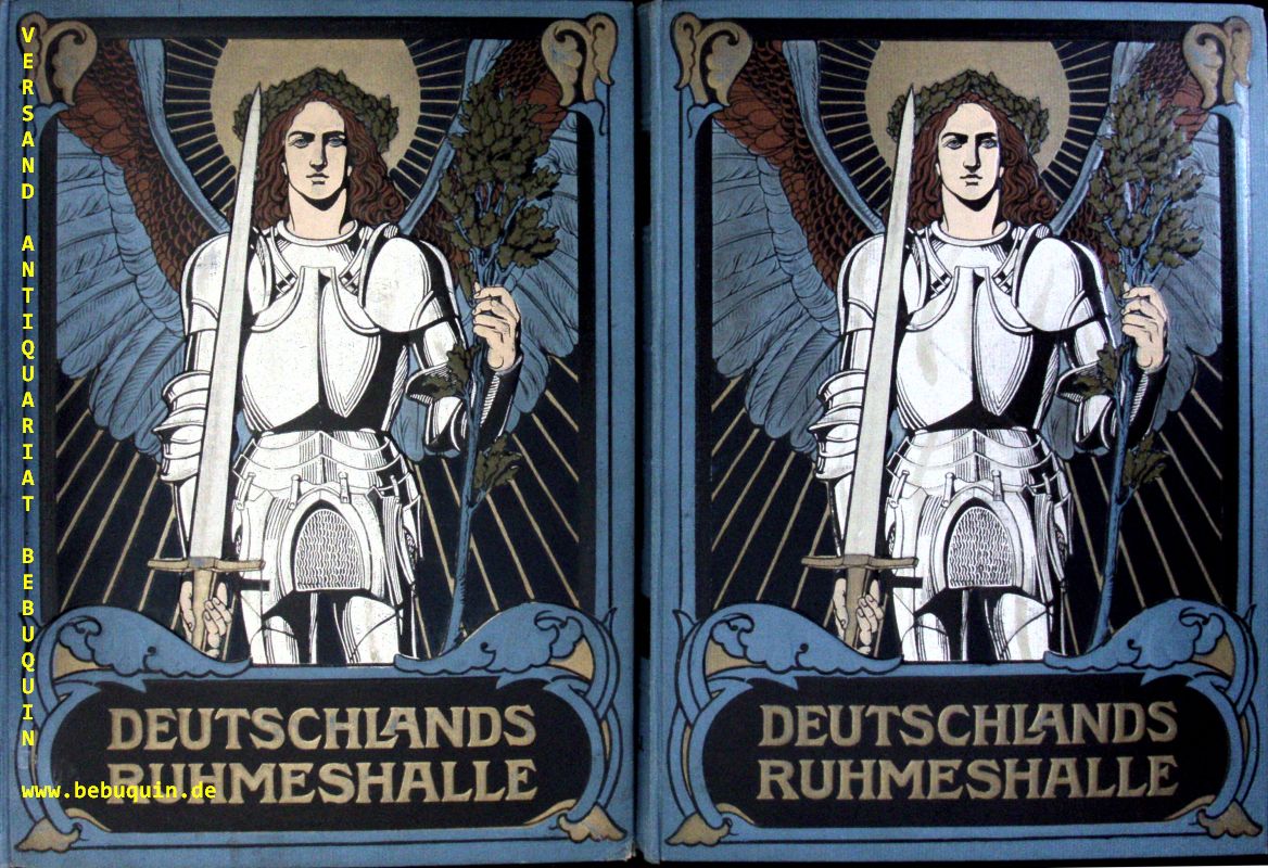 MÜLLER-BOHN, Hermann: Deutschlands Ruhmeshalle. Ein Buch für Haus und Familie. 2 Bände. Berlin (Kittel), ca 1900. 4°. 894 S. mit zahlr. teils farb. Kunstbeilagen + Textabb. reich verzierter und geprägter OLn. gutes Ex. EA.