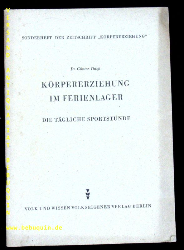 GYMNASTIK.– THIESS, Günter: Körpüererziehung im Ferienlager. Die tägliche Sportstunde. Berlin (Volk und Wissen), 1960. Gr. 8°. 68 S. mit zahlr. Abb. OKart. etwas lichtrandig. seltene EA.