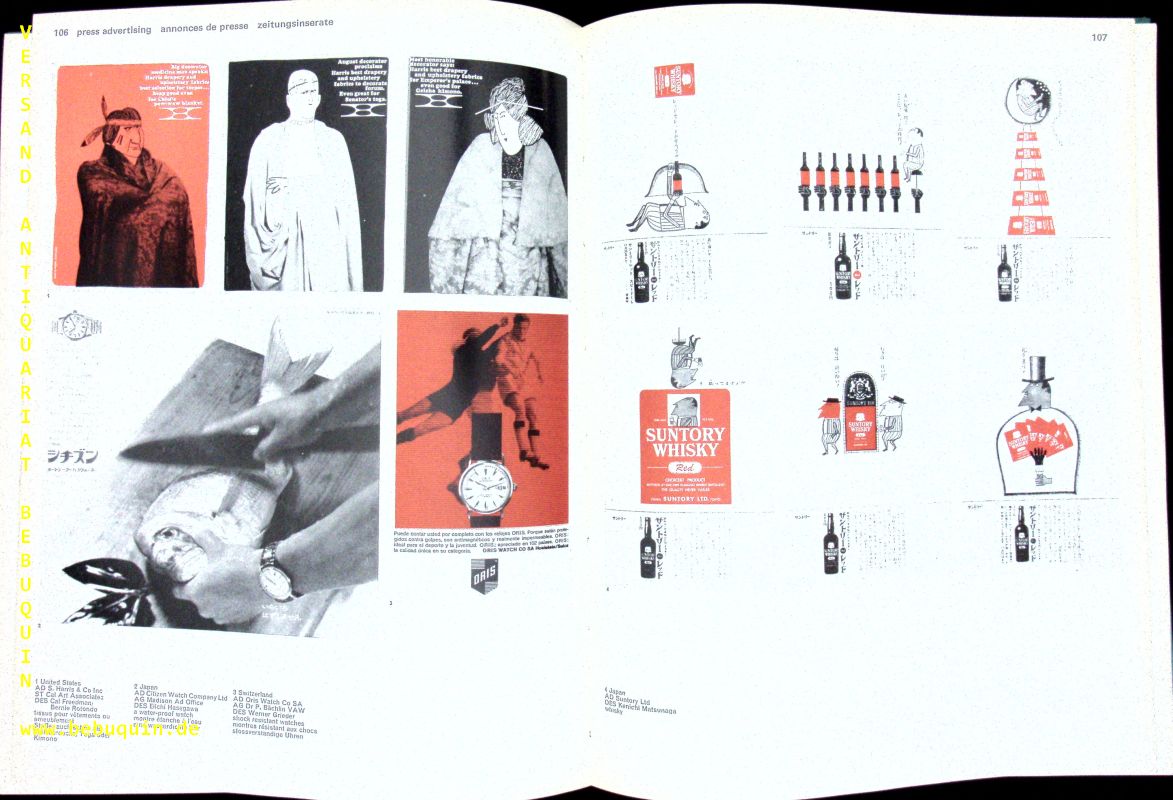 DESIGN.– LOCKWOOD, Arthur: Modern publicity 1965/6. Hrag. von Ella Moody. London (Studio Vista), 1965. 4°. 175, XII S. mit zahlr. teils farb. Bildern. OLn. eine Kante mit Wasserrand. EA.