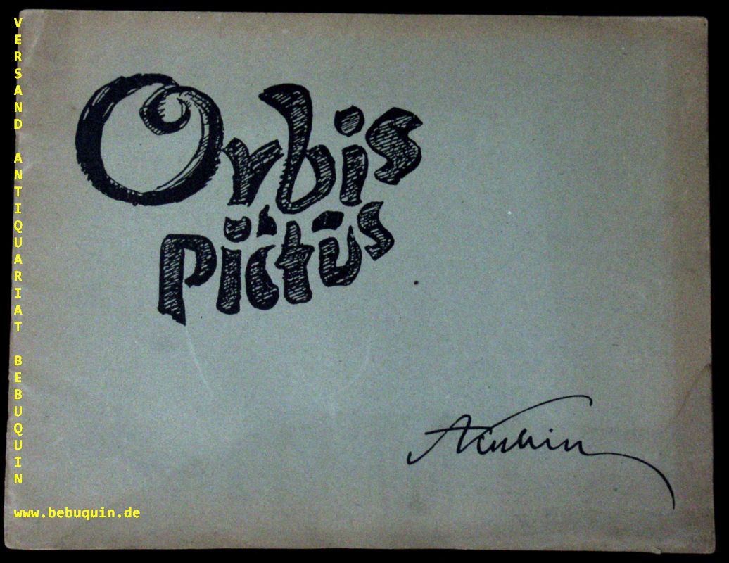 KUBIN, ORBIS PICTUS.– KUBIN, Alfred.: Ausstellung im Graphischen Kabinett der Galerie Henning. Halle, Februar – März 1948. Quer 4°. 16 Bl. mit einer Vorbemerkung Kubins, einer Würdigung durch Richard Horn sowie diverse Zeichnungen auf 26 S. ill. OKart. Rand gebräunt, anfangs mit stärkerem Wasserrrand. EA.