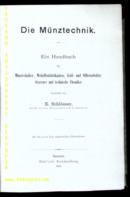 NUMISMATIK.– SCHLÖSSER, E.: Die Münztechnik. Ein Handbuch für Münztechniker, Medaillenfabrikanten, Gold- und Silberarbeiter, Graveure und technische Chemiker. Hannover (Hahn), 1884. Gr. 8°. 249 S. mit 121 Textabb. HLn von ca 1920. leicjht wellig, sonst gut. seltene EA.