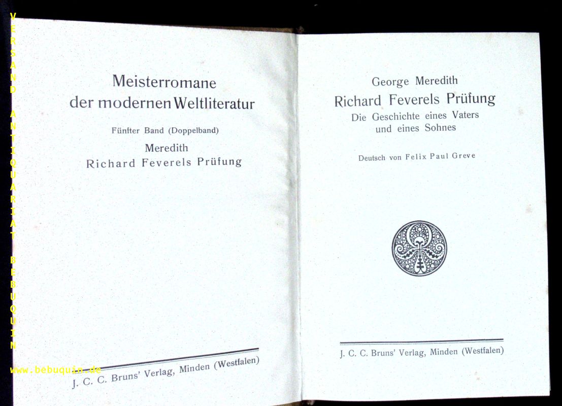 MEREDITH, George: Richard Feverels Prüfung. Die Geschichte e. Vaters u. e. Sohnes. D.v. Felix Paul Greve. 2 Bände in 1 Bd. Minden (Bruns), (1905), 316, 328, III S. OLn. Einband angeschmutzt. = Meisterromane der modernen Weltliteratur, Bd. 5 (Doppelbd.). dt. EA.