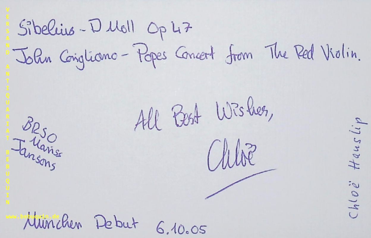 HANSLIP, Chloe (Violinistin): eigenhändig signierte und datierte Autogrammkarte mit eigenhändiger Programmbeschreibung. München (Philharmonie), 6.10.2005. 8 x 12,5 cm. Karteikarte.