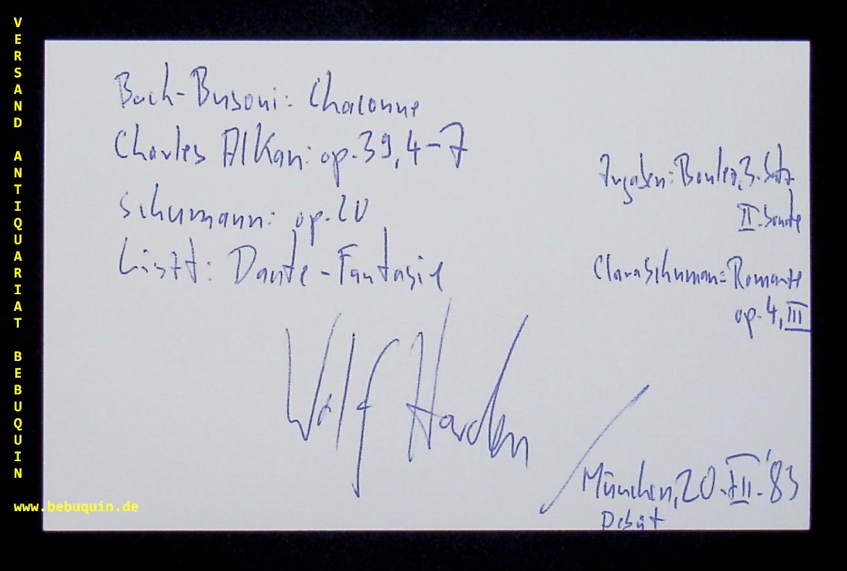 HARDEN, Wolf (Pianist): eigenhändig signierte und datierte Autogrammkarte. München (Philharmonie), 20.12.1983. 8 x 12,5 cm. Karteikarte. Wolf Harden (* 13. Mai 1962 in Hamburg) ist ein deutscher Pianist. (Wikipedia)