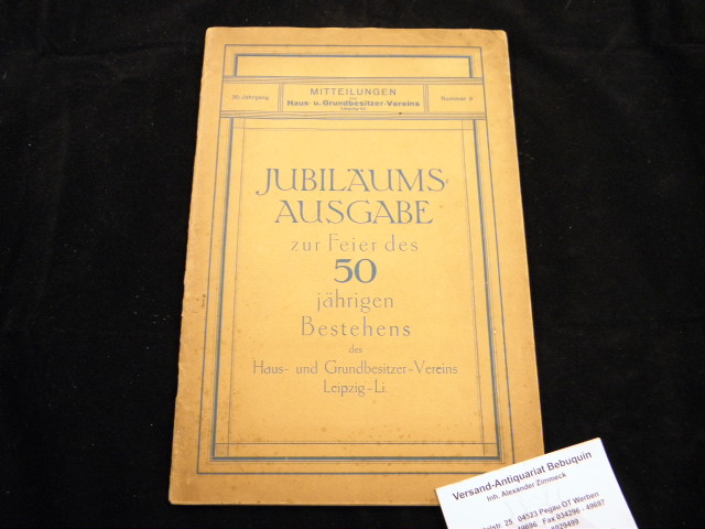 LEIPZIG.– HAUS- UND GRUNDBESITZER VEREIN.– Jubiläums-Ausgabe zur Feier des 50jährigen Bestehens. Leipzig, 1930. 4°. 40 S. mit zahlr. Abb. ill. OKart. etwas gebräunt. = Mitteilungen. 20. Jg. Nummer 2. EA.