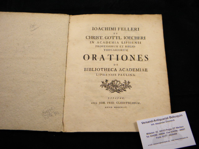 LEIPZIG.– FELLER, Joachim + JÖCHER, Chrsitian Gottlieb: Orationes de Bibliotheca Academia Lipsiensis Paulina. Leipzig (Gleditsch), 1744. Gr. 8°. 4 Bl., LX S. mit gestochenem Buchschmuck. Pb der Zeit. feines Ex. EA des gereimten, lat./dt. Spendenaufrufes zugunsten der Leipziger Universitätsbibliothek. Christian Gottlieb Jöcher (1694 – 1758) war ein deutscher Gelehrter, Bibliothekar und Lexikograf.