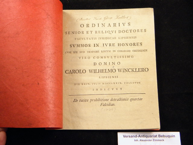 LEIPZIG.– WINCKLER, Carl Wilhelm: Ordinarius senior et reliqui Doctores. Facultatis iuridicae Lipsiensis summos in iure Honores. Leipzig , 1779. XII S. moderner Kart. gut erhalten. EA.