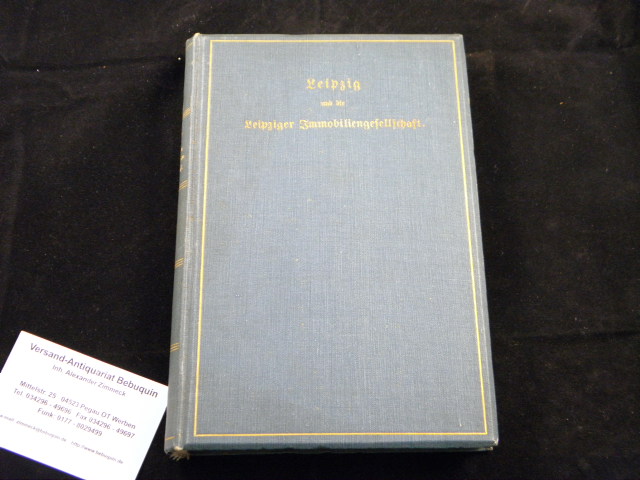LEIPZIG.– WUSTMANN, Gustav: Leipzig und die Leipziger Immobiliengesellschaft. Ein Beitrag zur Geschichte der Stadt im letzten Drittel des neunzehnten Jahrhunderts. 2. Aufl. Leipzig, 1903. 182 S.+ 19 ganzseitige Tafeln und dem so oft fehlenden farbigen, mehrfach gefalteten losen Stadtplan, Goldschnitt, farbig gemusterte Vorsatzpapiere. OLn mit Goldprägung. schönes Ex.