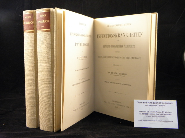 MEDIZIN.– HIRSCH, August: Handbuch der historisch-geographischen Pathologie. 3 Abtheilungen in 3 Bänden. Erste Abtheilung: Die allgemeinen acuten Infectionskrankheiten; Zweite Abteilung: Die chronischen Infections- und Intoxications-Krankheiten. Parasitäre Krankheiten, infectiöse Wundkrankheiten und chronische Ernährungs-Anomalieen; Dritte Abtheilung: Die Organkrankheiten nebst einem Register über die drei Abtheilungen. Zweite, vollständig neue Bearbeitung. 3 Bände. Stuttgart (Enke), 1881 – 1886. Bd. 1: VIII, 481 S., 1 Bl.; Bd. 2: VI, 467 S.; Bd. 3: IV, 557 S späteres Ln mit goldgeprägtem Lederrückenschild. NaV, nur leicht bestaubt, teils unaufgeschnitten.