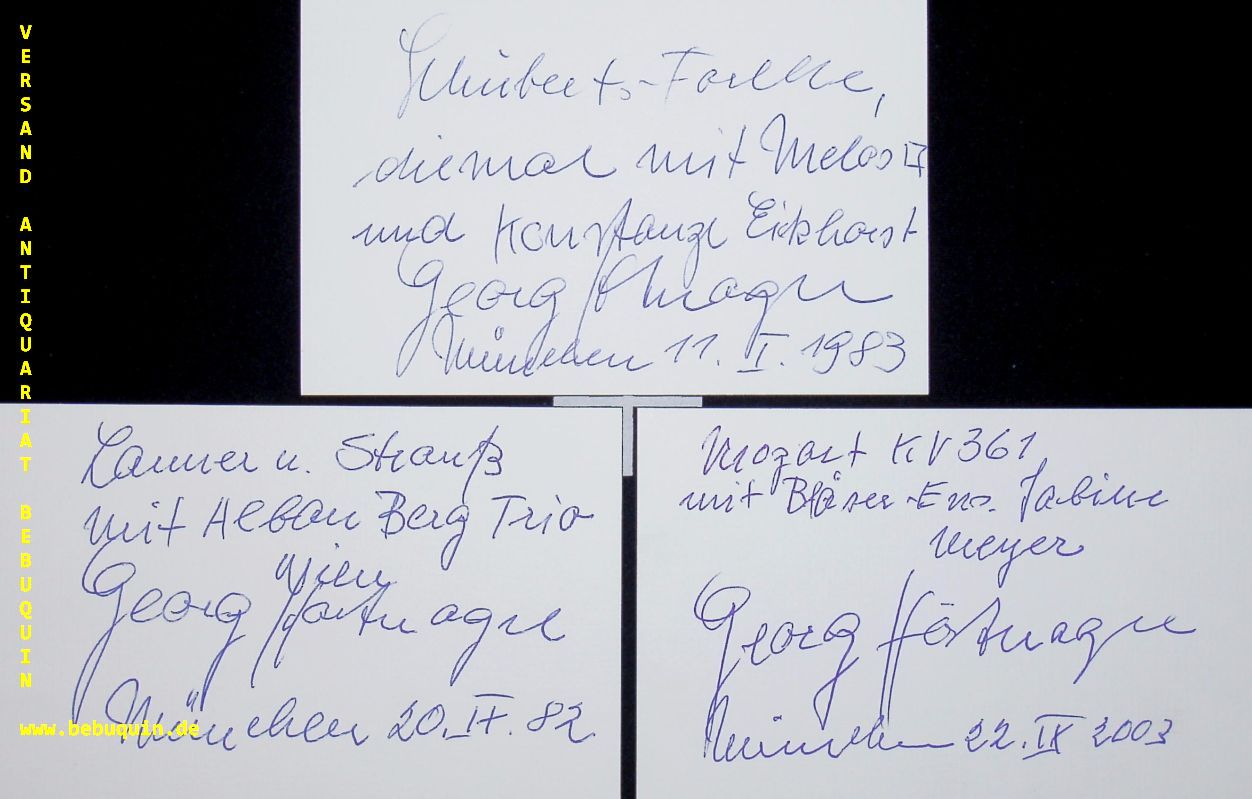 HÖRTNAGEL, Georg (Bassist): 3 eigenhändig signierte und datierte Autogrammkarten. München (Philharmonie), 1982 – 2003. 8 x 12,5 cm. 3 Karteikarten. Georg Hörtnagel hatte zwei Karrieren: Die des ausübenden Musikers, der mit dem Kontrabass die ganze Welt bereist hat und der mit dem Alban Berg Quartett, dem Amadeus-Quartett und Benjamin Britten, mit Martha Argerich, Svjatoslav Richter, Gidon Kremer oder Christoph Eschenbach auftrat – rund 800 Mal hat er weltweit in Franz Schuberts „Forellenquintett“ den Bass gespielt. Und die des Impresarios, der über 55 Jahre das Konzertleben Münchens maßgeblich mitgestaltet hat. Bereits im Alter von zwölf Jahren wusste er: „Ich will ein Leben in der Musik.“ (Hörtnagel)