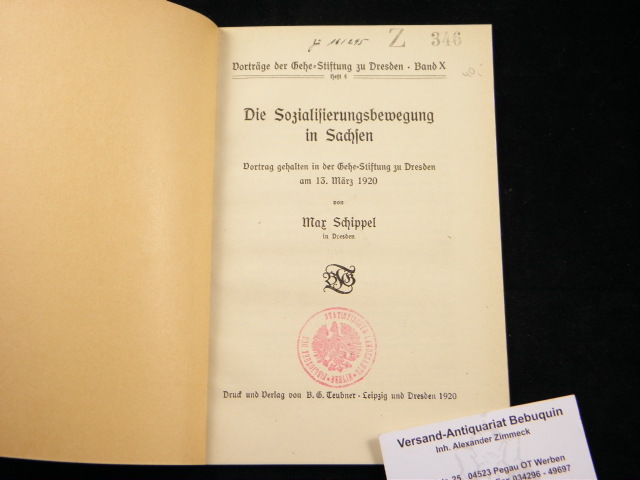 DRESDEN.– SCHIPPEL, Max: Die Sozialisierungsbewegung in Sachsen. Vortrag gehalten in der Gehe-Stiftung zu Dresden am 13. März 1920. Dresden (Teubner), 1920. 36 S. moderner HLn. StaT. seltene EA.