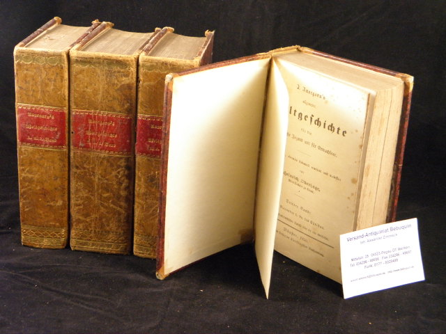 OVERHAGE, Heinrich: Annegarn’s allgemeine Weltgeschichte für die katholische Jugend und für Erwachsene. 4. Aufl. 8 in 4 Bänden. Münster (Theissing), 1850-1852. 3300 S. mit 3 Falttabellen (Zeittafeln). HLdr der Zeit mit goldgeprägten Rücken. bestaubt, eine Falttafel mit kleinem Einriss, sonst gut erhalten. 1. Band: Von Erschaffung der Welt bis Cyrus. 2. Band: Von Cyrus bis Alexander d. Gr. 3. Band: Von Alexander d. Gr. bis Christus. 4. Band: Von der Völkerwanderung bis auf Rudolph von Habsburg. 5. Band: Von Rudolph von Habsburg bis zur Entdeckung von America. 6. Band: Von der Entdeckung Americas bis zum westfälischen Frieden. 7. Band: Vom westfälischen Frieden bis zur Befreiung Europa’s. 8. Band: Von der Befreiung Europa’s bis auf unsere Tage. Josef Annegarn (* 13. Oktober 1794 in Ostbevern; † 7. Juli 1843 in Braunsberg) war ein Theologe, Pädagoge und Professor für Kirchengeschichte und Kirchenrecht. Allgemeine Weltgeschichte für die katholische Jugend, 7 Bände, Münster 1827 bis 1829. (ab der 3. Aufl. 1845 in 8 Bänden bearb. von Heinrich Overhage, spätere Ausgaben durch verschiedene Bearbeiter unter dem Titel Annegarn’s Weltgeschichte, 11. und letzte Aufl. 1929/1930). (Wikip.).