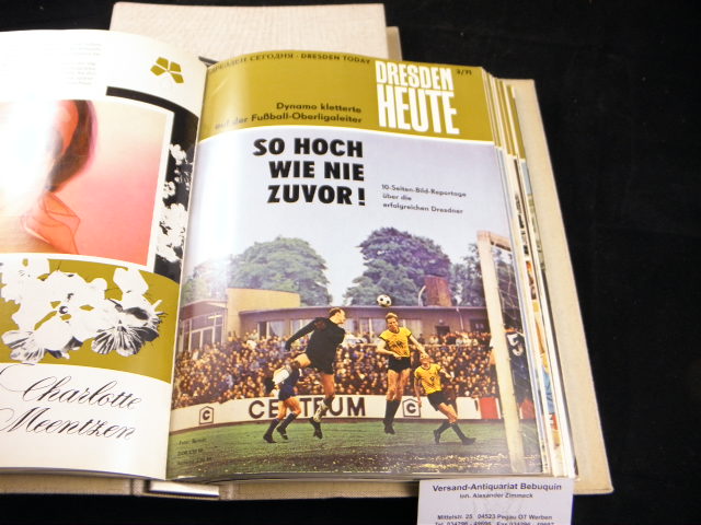 DRESDEN.– DRESDEN HEUTE.– 18 Hefte der seltenen dreisprachigen Zeitschrift: deutsch, russisch, englisch. Dresden 1969 – 1973. 4°. ca 700 S. mit zahlr. teils farb. Abb. farb. ill. OKart in Leinenklemmordner. tadellos. Hier die Nummern 1969/1 – 1972/2 für zusammen.