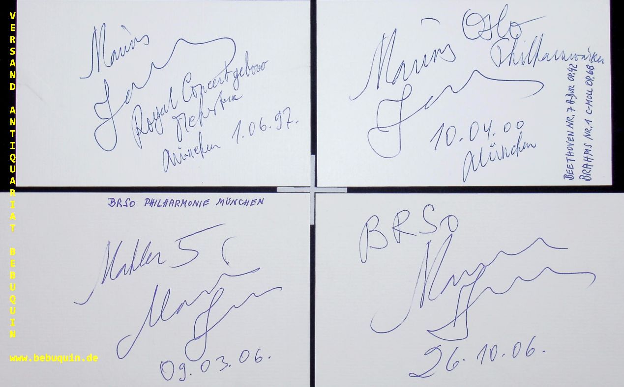 JANSONS, Mariss ( Dirigent): 16 eigenhändig signierte und datiere Autogrammkarten. München (Philharmonie), 1995 – 2009. 8 x 12,5 cm. 16 Karteikarten. Mariss Jansons (* 14. Januar 1943 in Riga; † 1. Dezember 2019[2] in Sankt Petersburg) war ein international tätiger lettischer Dirigent. Er studierte Violine, Klavier und Dirigieren am Leningrader Konservatorium und ging 1969 nach Österreich, wo er seine Ausbildung bei Hans Swarowsky und Herbert von Karajan fortsetzte. 1973 wurde er wie sein Vater zuvor stellvertretender Dirigent der Leningrader Philharmoniker. Von 1979 bis 2000 war er Leiter des Osloer Philharmonie-Orchesters, mit dem er zahlreiche Aufführungen, Aufnahmen und Tourneen absolvierte. 1996 erlitt er während des Dirigierens von La Bohème einen lebensbedrohlichen Herzanfall auf dem Podium in Oslo, kurz darauf im Spital einen zweiten. Sein Vater war beim Dirigieren verstorben. In der Nacht zum 1. Dezember 2019 starb Mariss Jansons im Alter von 76 Jahren in St. Petersburg im Kreis seiner Familie an den Folgen einer Herzerkrankung. Die Süddeutsche Zeitung titelte in ihrem Feuilleton-Leitartikel: „Die Welt mit Klang umarmen: Der aufrichtigste, integerste, empathischste Dirigent der Welt ist tot.“ (Wikipedia)