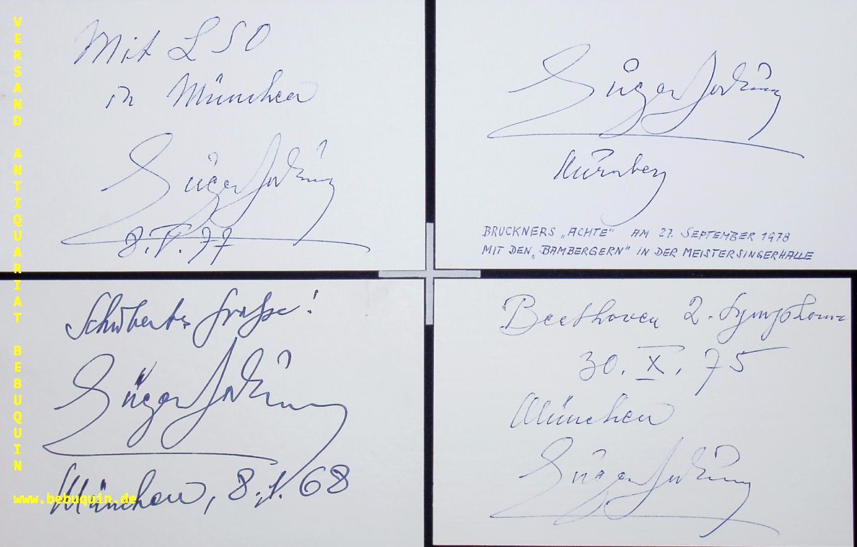 JOCHUM, Eugen ( Dirigent): 13 eigenhändig signierte und zumeist datierte Autogrammkarten mit zahlreichen Programmbeschreibungen. Mit Bamberger Symphonikern, London Philharmonic Orchestra, Wiener Symphonikern u.a. München (Herkulessaal), 1963 – 1986. 8 x 12,5 cm. 13 Karteikarten. Eugen Jochum (* 1. November 1902 in Babenhausen, Schwaben; † 26. März 1987 in München) war ein deutscher Dirigent und zählt zu den bekanntesten Interpreten der Werke Anton Bruckners. (Wikipedia)