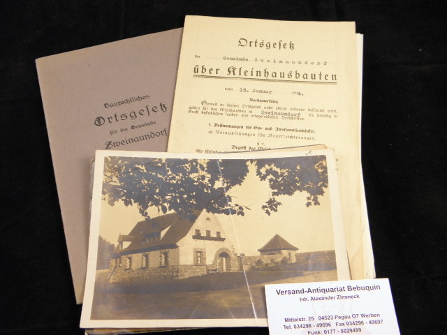 LEIPZIG.– BAURECHTLICHES ORTSGESETZ FÜR DIE GEMEINDE ZWEINAUNDORF MIT GUTSBEZIRK.– Zweinaundorf, 1926. 15 S. OKart. tadellos, Beilagen teils mit Anstreichungen. EA mit diversen Anlagen wie dem Ortsgesetz vom 14. Januar 1924 diversen Teilbebauungsplänen und 2 Originalfotos.