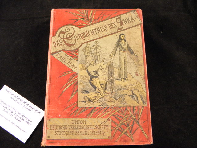 MAY, Karl: Das Vermächtnis des Inka. 3. Aufl. Stuttgart (Union), (1900). 552 S. + 16 Farbendruckbilder von Ewald Thiel mit den gestalteten Vorsätzen mit Verlagswerbung. ill. OLn. (DB 21). Einband berieben, Rücken gebräunt, eine Kante ca 5 cm angeplatzt, hinterer Deckel mit Wasserschaden, innen nur vereinzelt braunfleckig, sonst fest und noch gut. Frühe Ausgabe Plaul 275.3.