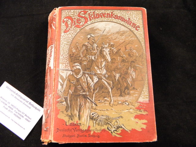 MAY, Karl: Die Slavenkarawane. 3. Aufl. Stuttgart (Union), 1901. Gr. 8°. 496 S. mit 16 Tondruckbildern von Gustav Adolf Closs mit den gestalteten Verlagsvorsätzen farb. ill. OLn. (DB 17). schief gelesen, Kanten berieben, hinterer Deckel mit Wasserschaden, innen nur leicht wasserwellig, StaT. Plaul 249.3.