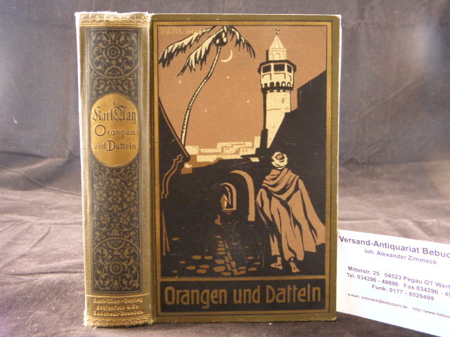 MAY, Karl: Orangen und Datteln. Reiseerzählungen. 121.– 130. Tsd. Radebeul (Karl May), (1936). 610 (2) S. farb. ill. OLn. vorderes Gelenk gelockert, mit strahlendem Rückengold. = Gesammelte Reiseerzählungen, Bd. 10. 1. Aufl. der korrigierten Fassung. Hermesmeier / Schmatz GW 10.18.