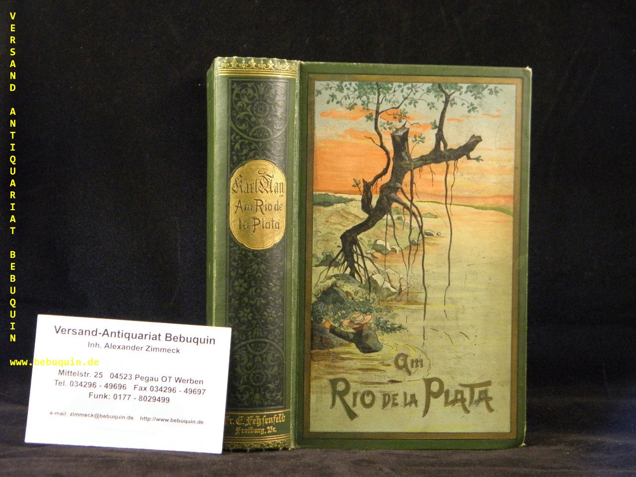 MAY, Karl: Am Rio de la Plata. Reiseerzählungen. 11.– 15. Tsd. Freiburg (Fehsenfeld), (1896). 676 S. mit gemusterten Vorsatzpapieren. farb. ill. OLn. (DB 62). minimal schief gelesen, Titelseite mit kleinem Stockfleck, Rücken goldglänzend, feines Ex. = Gesammelte Reiseerzählungen, Bd. XII. seltene frühe Ausgabe Plaul 253.2.